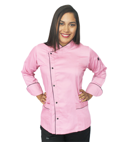 Es una chaqueta color rosa, contiene broche con botones negros, tiene dos bolsillos inferiores y ademas contiene bordes en la parte de los puños de las mangas.