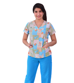 Conjunto con detalles de tela antifluido especial para la carrera de pediatría, contiene una capa de impermeabilidad de manera que ningún líquido manche, posee bolsillos inferiores y pantalón celeste de tela jarua.