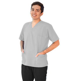 Conjunto para hombres que consiste en una blusa blanca con pantalón azul marino, disponibles en cualquier talla para la carrera de terapia física en la Universidad Católica.