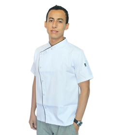 Es una camisa blanca para hombre, con broche màs un sesgo negro, especial para personal de cocina.