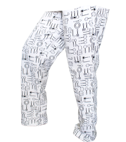 Es un pantalón color blanco con diseños de cocina, contiene cordón para ajustar segun la cintura de la persona, disponibilidad en toda talla.