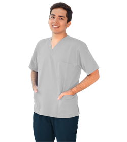 Conjunto para hombres que consiste en una blusa blanca con pantalón azul marino, disponibles en cualquier talla para la carrera de terapia física en la Universidad Católica.