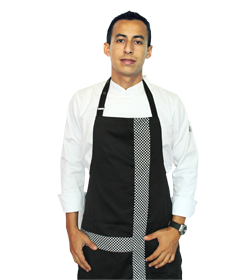 Es un delantal bicolor, negro y con detalles de cuadros grises, tambien contiene un bolsillo con borde de cuadros negros con gris, se ajusta con el grosor de la persona. Contiene una forma de cuadros grises que recorren de arriba a abajo el delantal y a la mitad recorre hacia la izquierda.